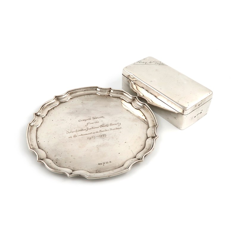 circular form, moulded border, the centre inscribed, diameter 25.3cm, plus a late-Victorian silver cigarette box, of rectangular form, the hinged cover inscribed, Birmingham 1899, approx. weighable 13oz. (2)