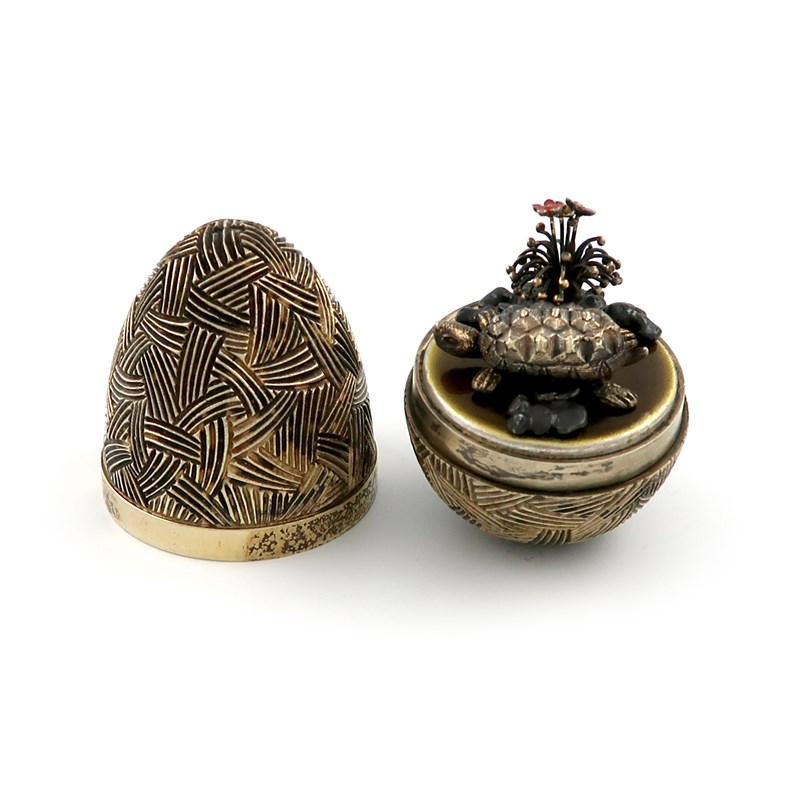 textured decoration, the cover opens to reveal a turtle with foliate and enamel decoration, height 7.4cm.