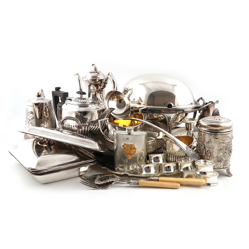 comprising: a revolving breakfast dish, with an ivory handle, a tankard, a tray, a waiter, a coffee pot, a hot water pot, a three-piece tea set, two entrée dishes and covers and other items. (qty)