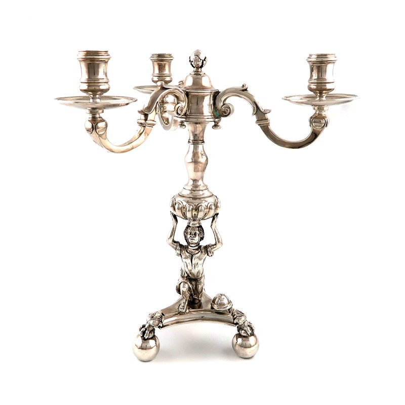 the column modelled as a kneeling chained male figure holding the fluted baluster stem, on a triangular base, on three claw and ball feet, the unmarked branches with three scroll arms each supporting a spool shaped capital with a plain circular drip pan, height 33cm, approx. weight 52oz.