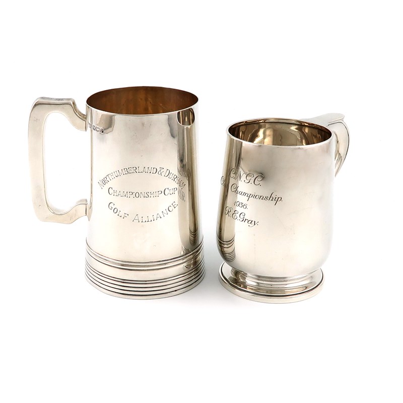 tapering circular form, scroll handle, on a raised reeded foot, inscribed, plus another silver trophy mug, by William Suckling Ltd, Birmingham 1935, baluster form, approx. total weight 22oz. (2)
