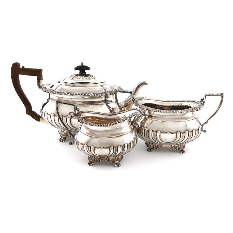 oblong bellied form, part-fluted decoration, foliate and gadroon border, leaf capped scroll handle, on four paw feet, length handle to handle 29.5cm, approx. weight 48.5oz. (3)