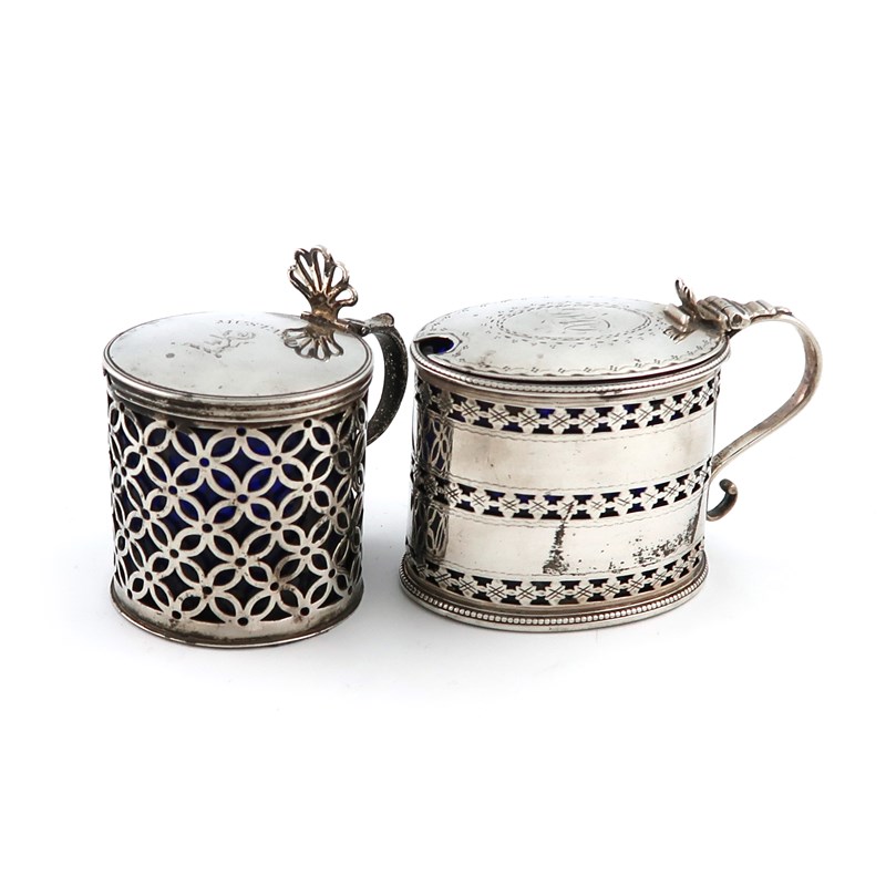 oval form, with three bands of pierced foliate decoration, beaded borders, with a blue glass liner, length 10cm, plus another George III silver mustard pot, by Aldridge and Green, London 1781, circular drum form, pierced decoration, the hinged cover with a crest and engraved 'MUSTARD', with a later blue glass liner, approx. total weight 6.4oz. (2)