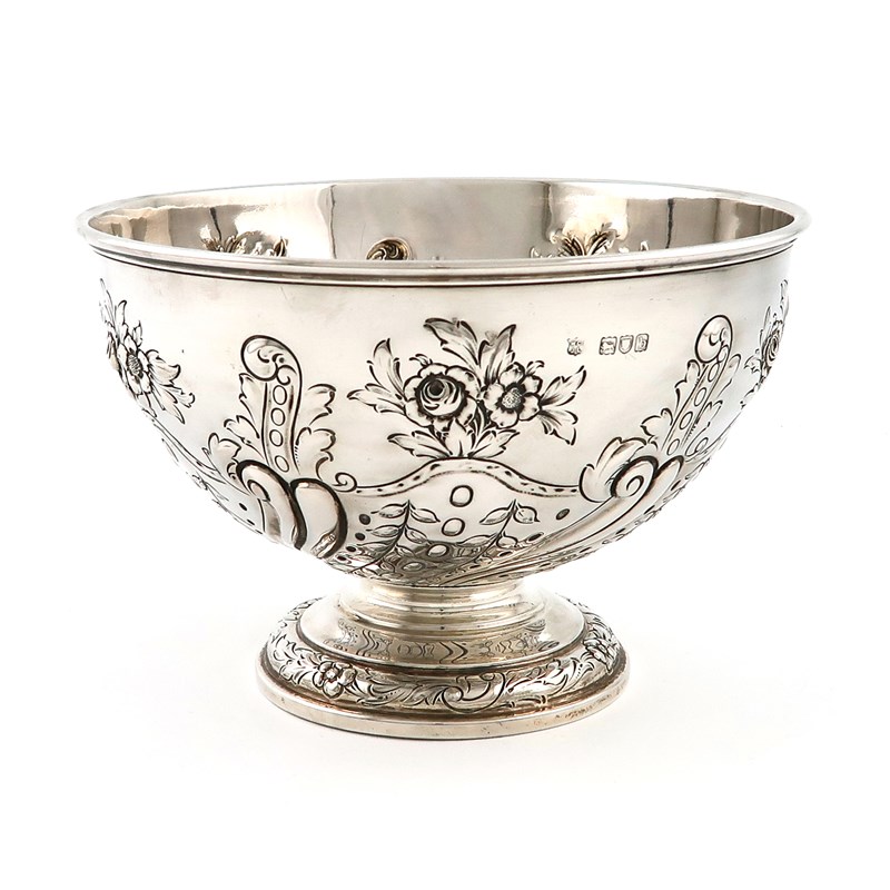 circular form, embossed foliate scroll decoration, on a raised circular foot, diameter 17.8cm, approx. weight 13oz.