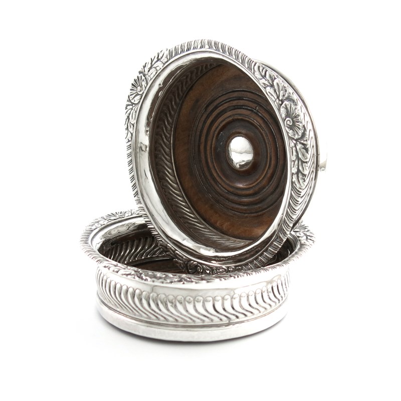 circular form, swirl-fluted decoration, foliate shell and gadroon borders, turned wooden bases, diameter 14.8cm. (2)