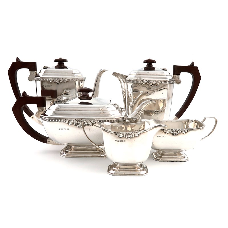 tapering rectangular form, canted corners, gadroon and foliate shell borders, scroll handles, on raised rectangular bases with canted corners, height of coffee pot 19.8cm, approx. weight 83oz. (5)