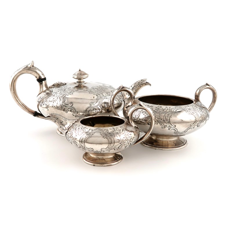 compressed circular form, engraved foliate scroll decoration, the hinged cover with a knop finial, the scroll handle with horn insulators, on circular bases, length handle to handle 27.5cm, approx. weight 42oz. (3)