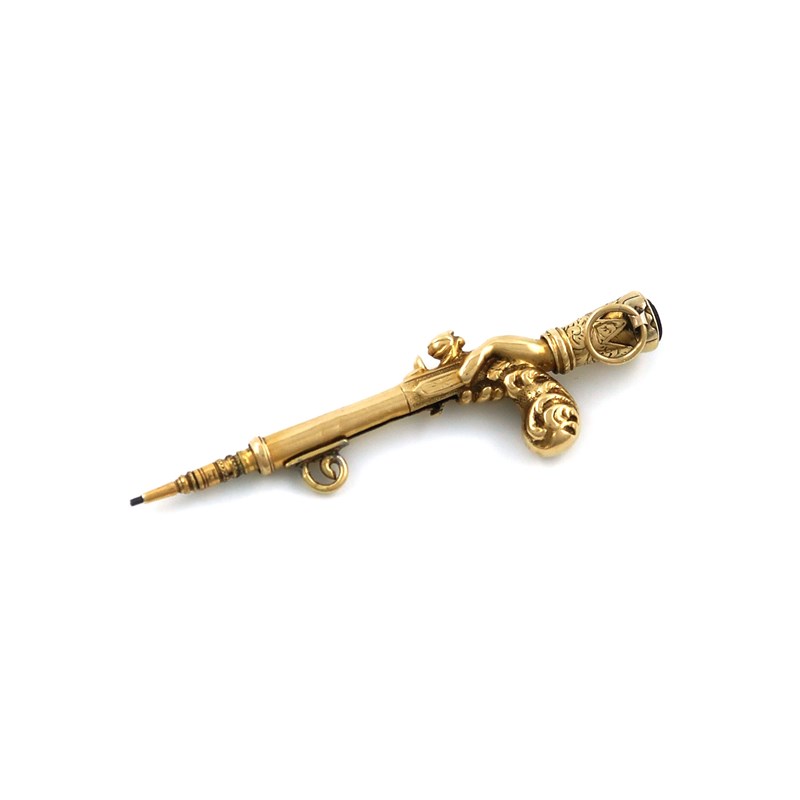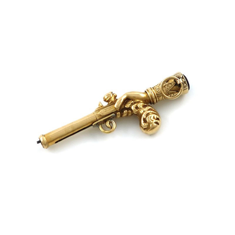 modelled as a pistol being held by a gauntleted hand and fist, length 4.5cm.