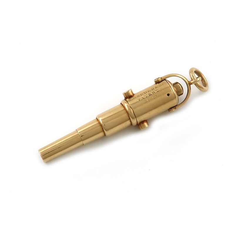 modelled as a canon, with a hinged ring attachment, length closed 6cm.