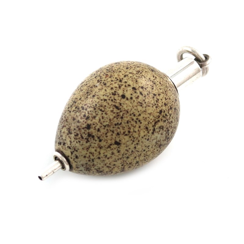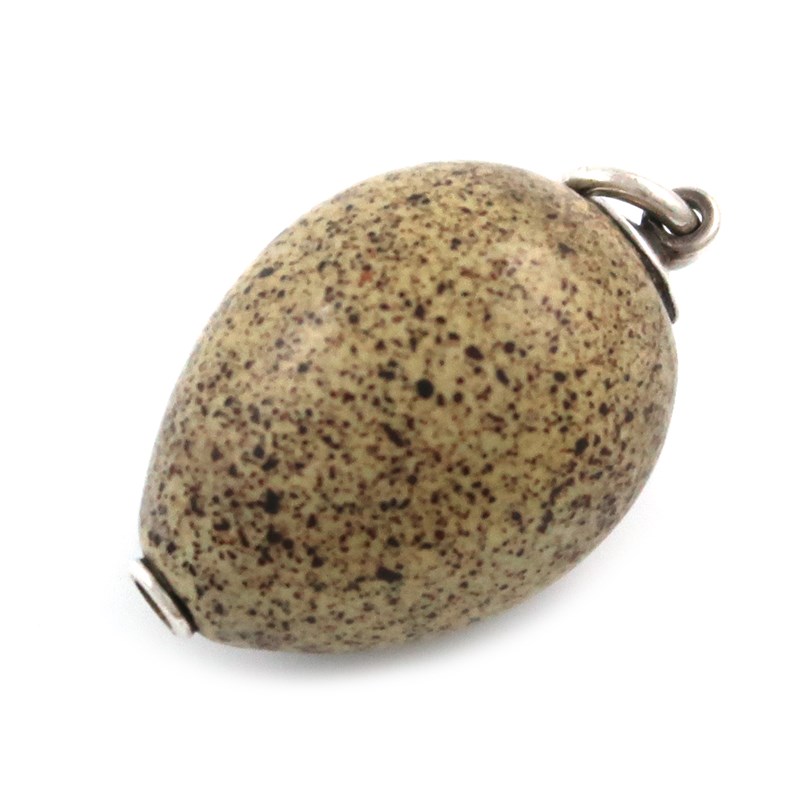 modelled as a bird's egg with mottled brown decoration, with a ring attachment, length 3.2cm.
