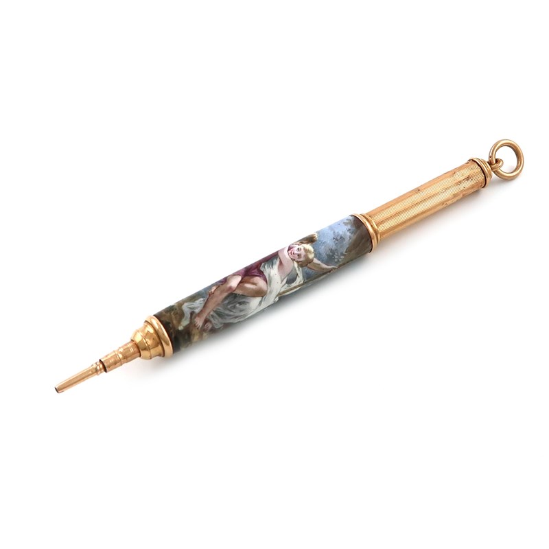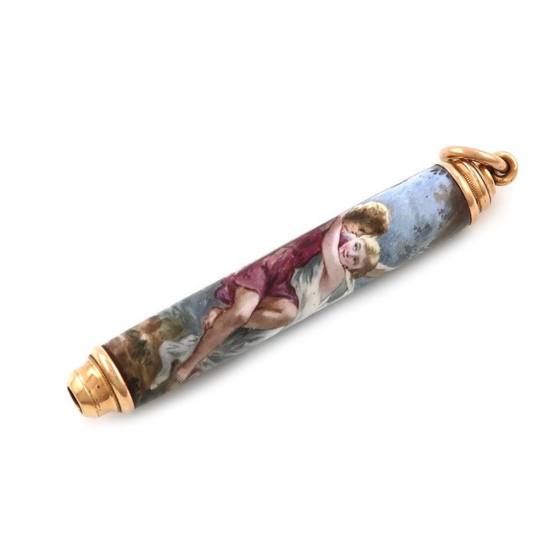 cylindrical form, enamelled with a courting couple on a swing, length closed 5.5cm.