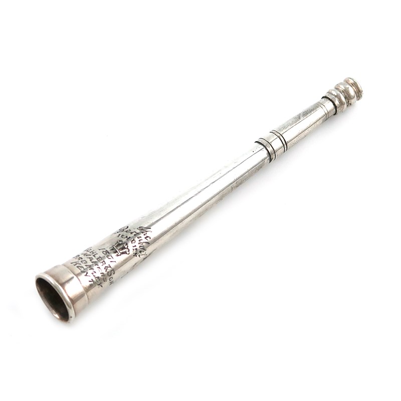 tapering circular form, engraved 'The Beaufort', and with the Prince of Wales Feathers above 'Ich Dien 1801', and 'Kohler and Son Makers Bromley Kent' , also engraved with initials, length closed 9.3cm.