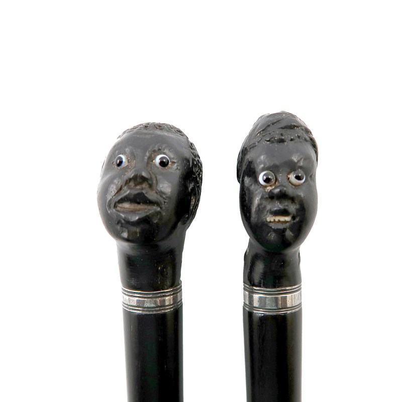 the terminals carved with caricatures of male heads, glass eyes, plain mounts, length 11.3cm and 11.7cm. (2)
