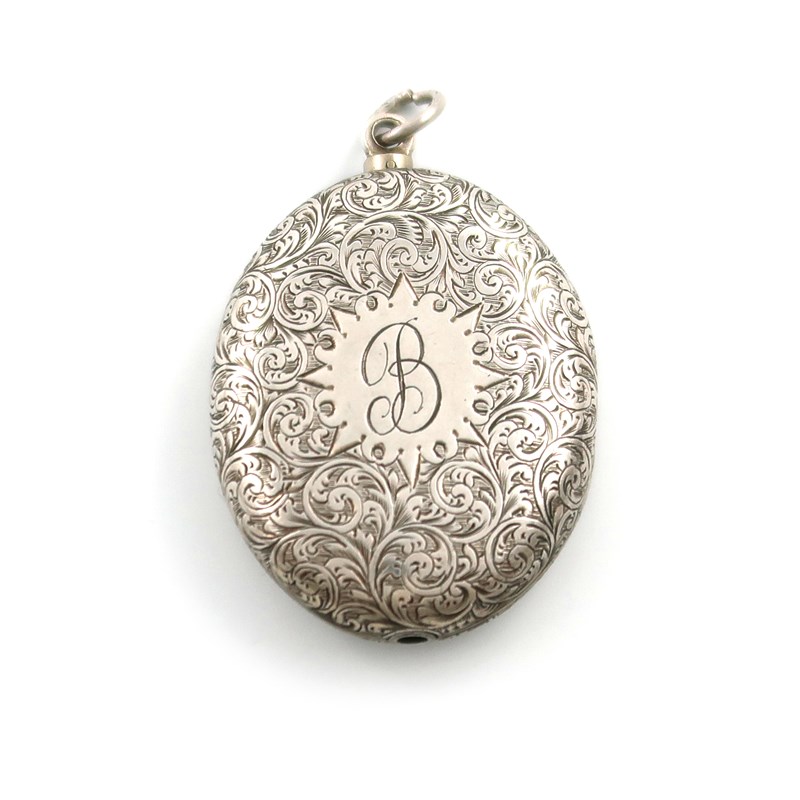 oval form, engraved foliate decoration, with a ring attachment, (mechanism not working), length 5cm, approx. weight 0.8oz.