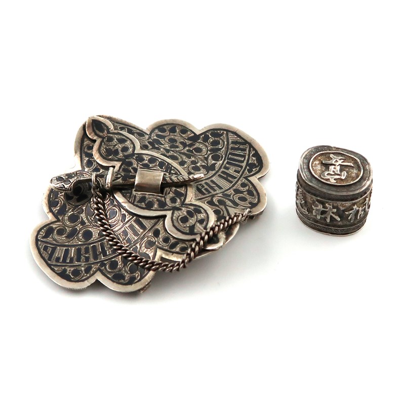 oval form, pull-off cover, plus a Russian silver and niello work belt buckle, shaped oval form, with a dagger clasp, length 7.3cm. (2)