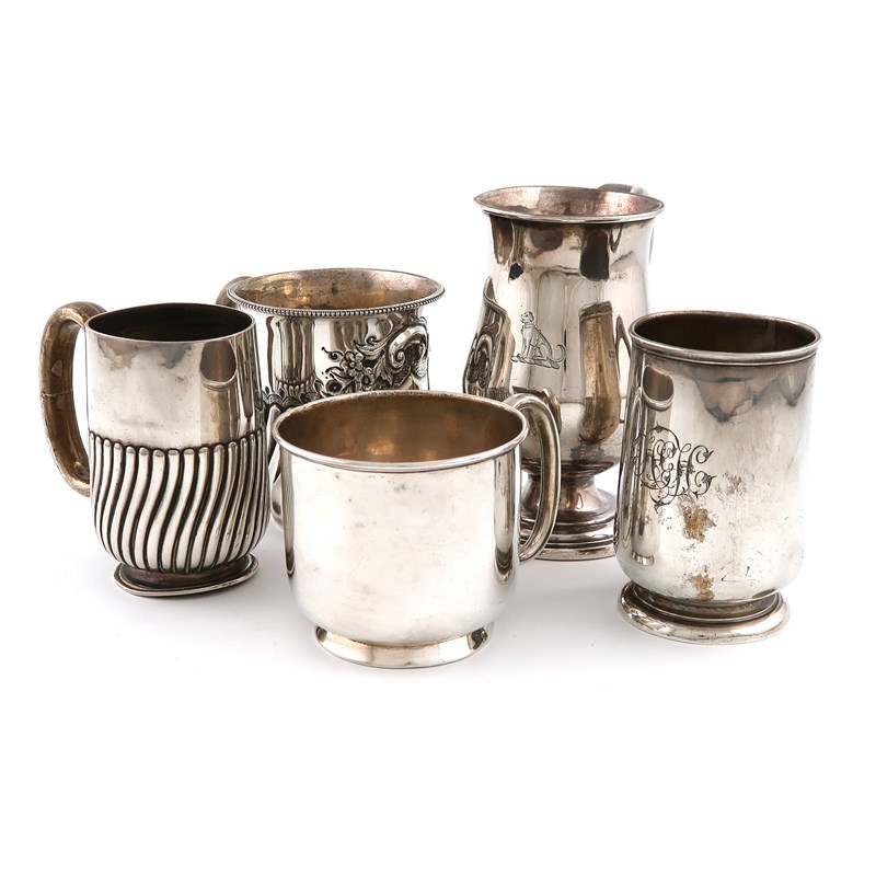 comprising: a George III one by Tudor & Leader, Sheffield 1779, baluster form, scroll handle, engraved with a crest, on a raised circular foot, plus four various others, approx. weight 18oz. (5)