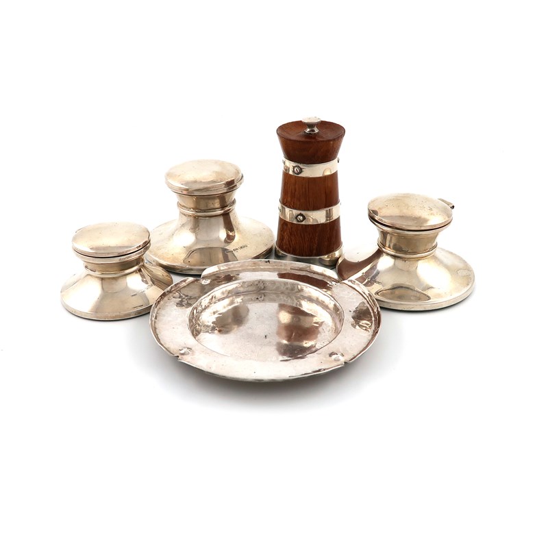 comprising: a silver-mounted oak churn pepper mill, by Hukin and Heath, Birmingham 1914, an Arts and Crafts dish, Birmingham 1920, plus three graduated capstan inkwells of plain circular form, approx. weighable 4oz. (5)