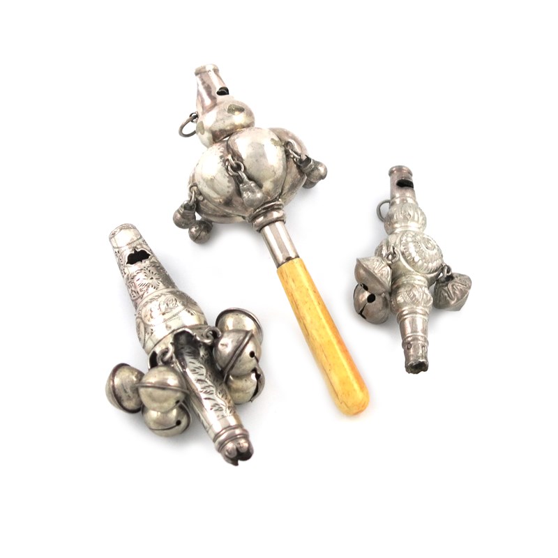 λA collection of three antique babies rattles, whistles and teethers,