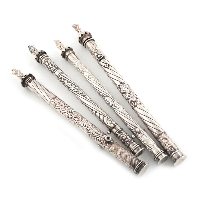 cylindrical form, embossed foliate scroll decoration, two of the hinged covers with a pixie finial, the other two with a figural finial, the base cover of three with a plain matrix, the other engraved with initials, approx. weight 5.1oz. (4)