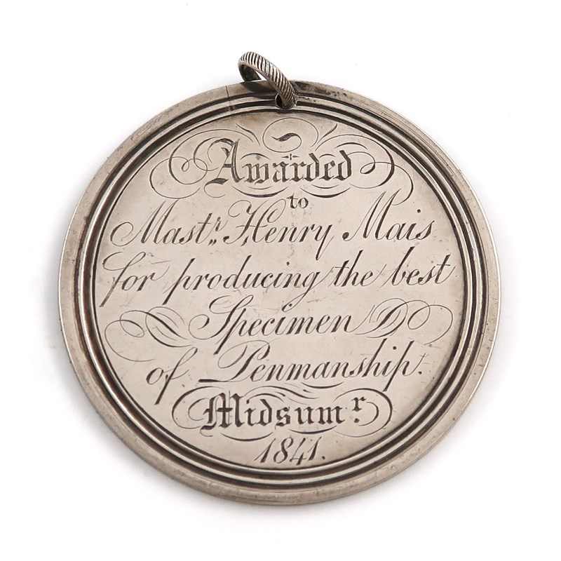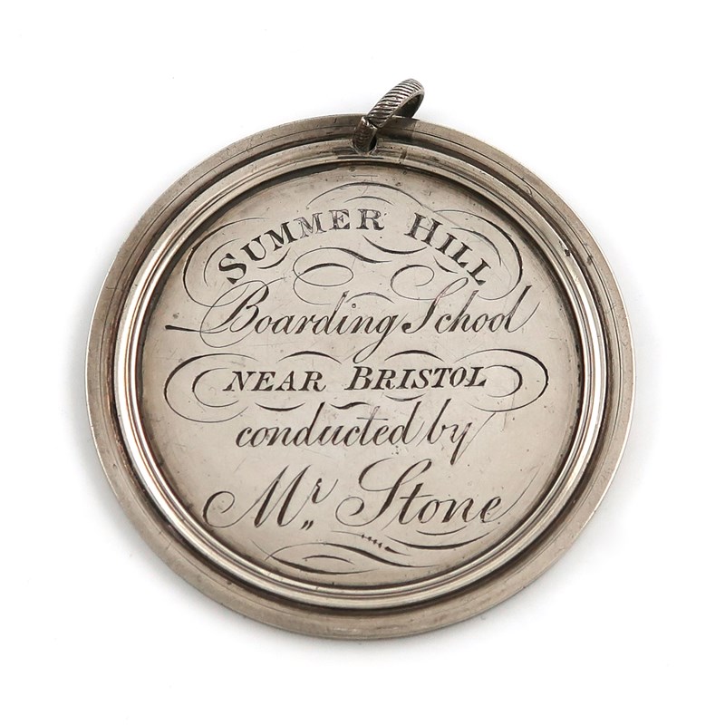 circular form, ring terminal, inscribed 'Summer Hill Boarding School Near Bristol conducted by Mr. Stone', the reverse inscribed 'Awarded to Master Henry Mais for producing the best specimen of Penmanship, Midsumr. 1841', diameter 5.3cm, approx. weight 0.5oz.