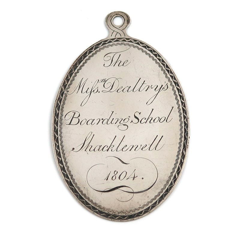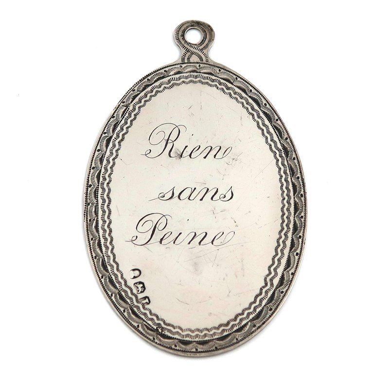 oval form, bright-cut borders, ring terminal, inscribed 'The Miss Dealtry's Boarding School Shacklewell, 1804', the reverse inscribed 'Rien sans Peine', length 7.8cm, approx. weight 0.3oz.