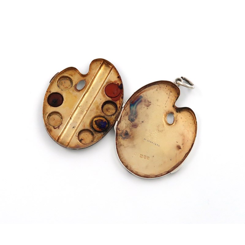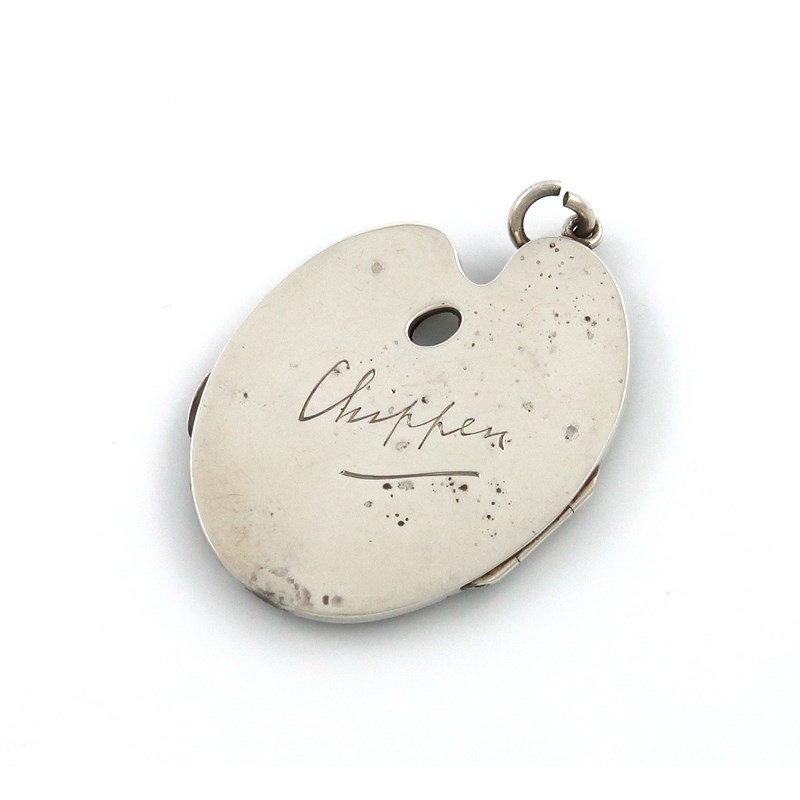 modelled as a palette, with seven paint compartments and a compartment for a paint-brush, gilded interior, with a ring attachment, inscribed 'Chipper', length 7cm, approx. weight 0.8oz.