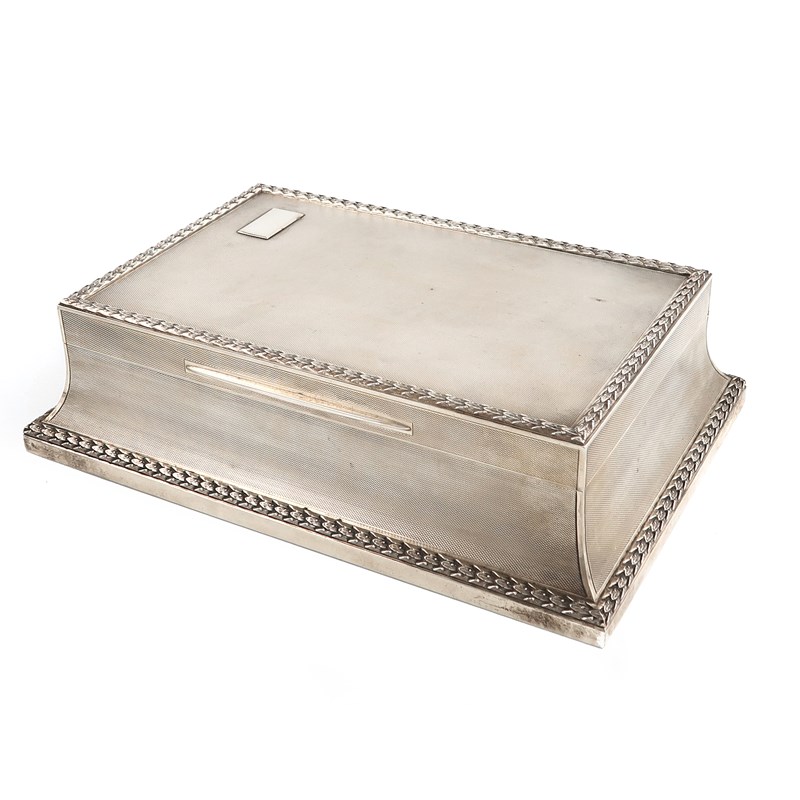 tapering rectangular form, engine-turned decoration, swag borders, the hinged cover with a vacant cartouche, wood lined, length of base 29cm.