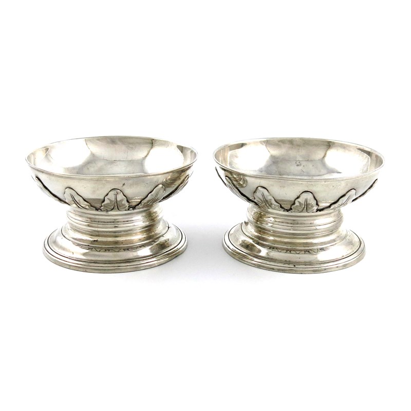 in the early 18th century manner, circular bowls, on raised circular bases with cut-card Acanthus leaf decoration, engraved with a crest, diameter 8.8cm, approx. weight 13.5oz. (2)