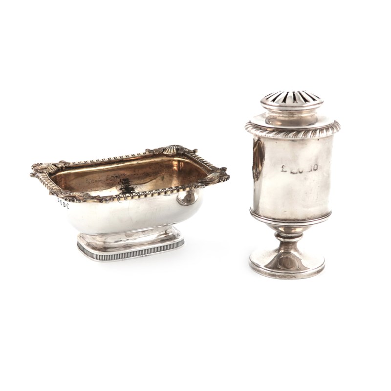 cylindrical form, gadroon border, on a circular foot, plus a George III salt cellar, London 1808, rectangular form, shell and gadroon border, approx. total weight 5.5oz. (2)