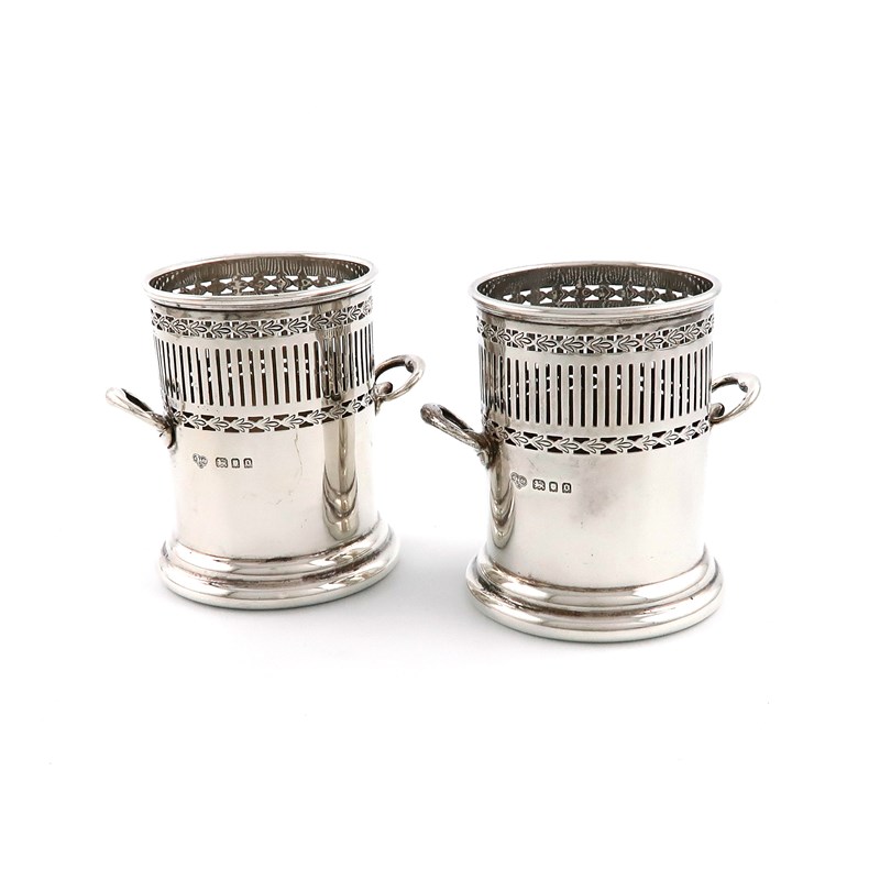 cylindrical form, pierced with vertical slats, scroll side handles, on circular bases, height 9.3cm, approx. weight 9.3oz. (2)