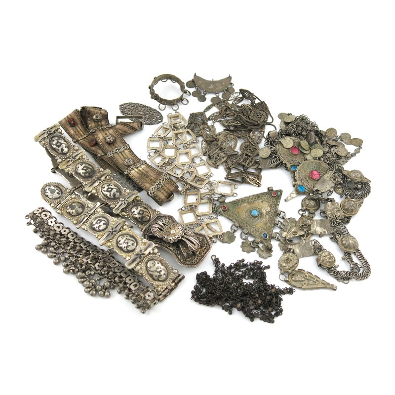 comprising: a Russian silver and niello work belt, Novocherkassk, 1881, plus another belt with niello decoration, and a filigree clasp, a belt of square link form, and other items. (qty)