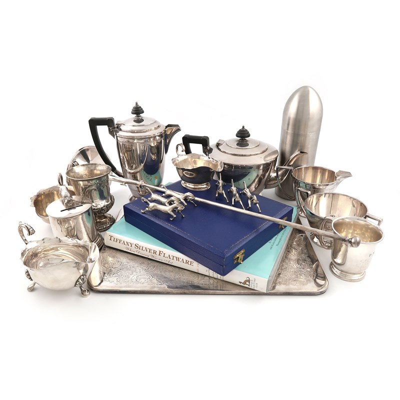 comprising silver items: a Victorian mug, London 1851, three single sauce boats, a mug, a Finnish miniature flag pole, plus electroplated items: a four-piece Art Deco tea set, a cased nut pick set, a money box, and other items including a book on Tiffany flatware, approx. weighable 20oz. (qty)