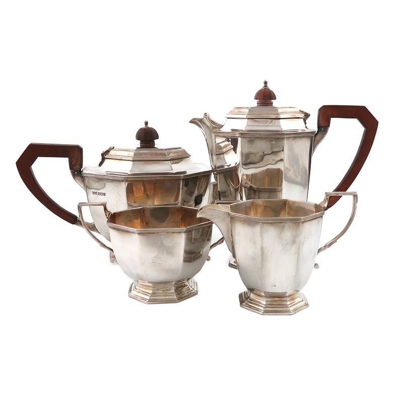 octagonal form, scroll handle, the hinged cover with a knop finial, on a raised octagonal foot, height of hot water pot 19.5cm, approx. weight 53.5oz. (4)