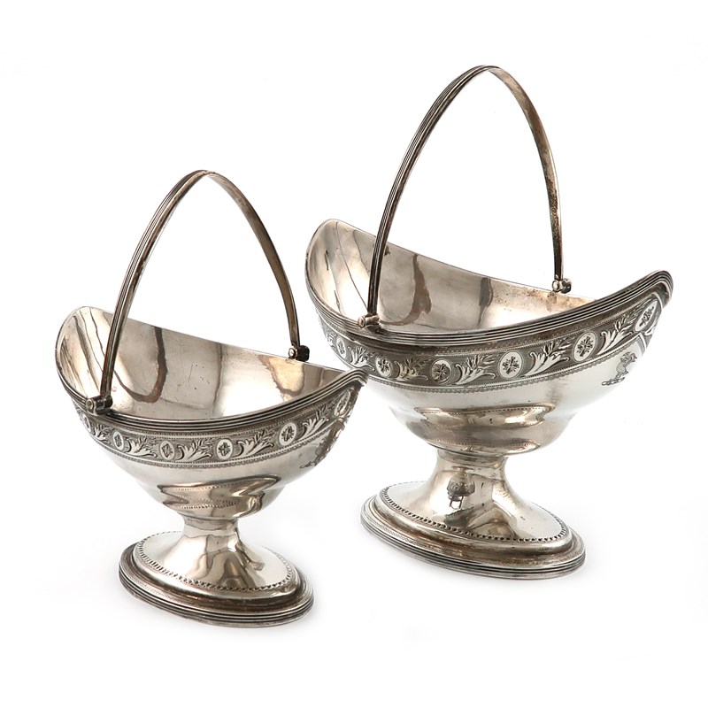 oval form, bright-cut foliate border, reeded borders and swing-handle, on raised oval bases, engraved with a crest, heights 11.8cm and 9.2cm, lengths 16.8cm and 13.8cm, approx. weight 12oz. (2)
