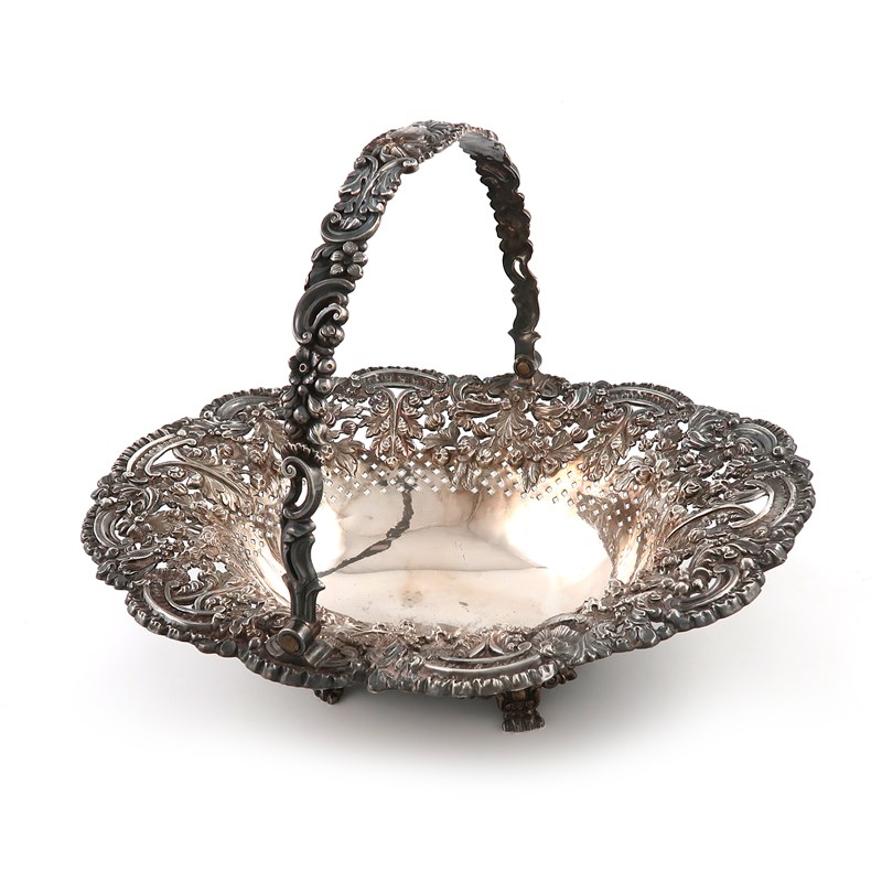 oval form, pierced and stamped foliate scroll decoration, pierced swing-handle, on four foliate capped paw feet, length 33.5cm, approx. weight 32oz.
