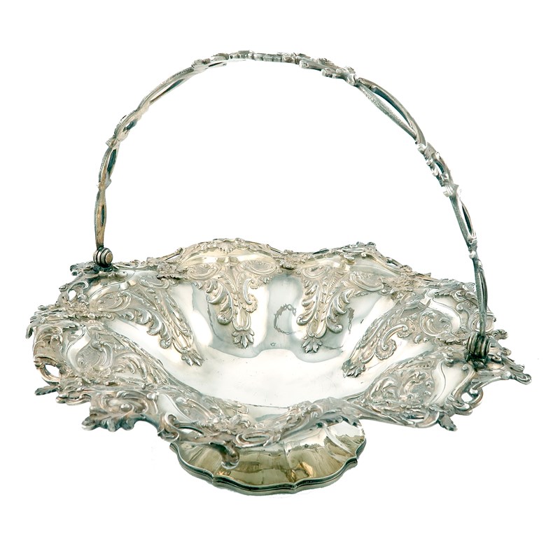 lobed circular form, embossed and chased with alternate panels of foliate decoration, pierced swing-handle, on a raised circular foot, diameter 36cm, approx. weight 48oz.