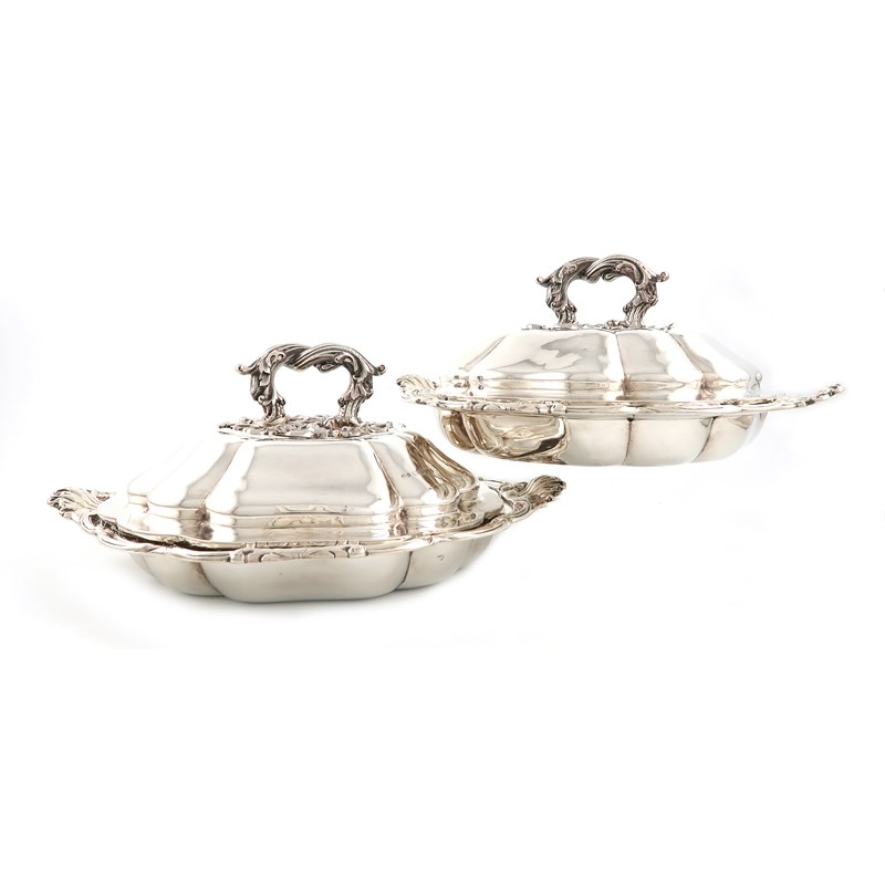 shaped lobed circular form, shell side handles, the pull-off covers with detachable foliate handles, the bases stamped 'STORR and MORTIMER', some damage, length 32.5cm, approx. weight 115oz. (2)