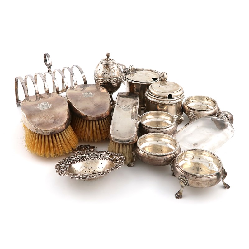 comprising: a Victorian mustard pot, by William Moulson, London 1853, circular form with two bands of foliate decoration, another Victorian mustard pot, London 1840, later glass liner, two pairs of George III cauldron salt cellars, London 1768 and 1773, three brushes, a George III caster, a toast rack, a tea strainer and a silver-mounted glass hip flask, approx. weighable 24oz. (qty)