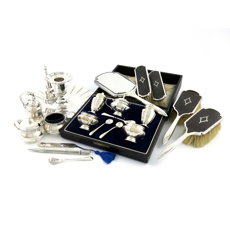comprising silver items: a five-piece silver and tortoiseshell dressing table set, by H. Matthews, Birmingham 1928, plus a cased five-piece condiment set, Birmingham 1922, a three-piece condiment set, a page marker, a pencil and an electroplated chamber stick, approx. weighable 7.5oz. (qty)