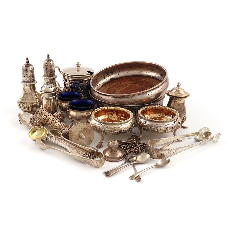 comprising: a mustard pot of circular form, pierced foliate scroll decoration, blue glass liner, by William Hutton and Sons, London 1900, a pair of Victorian salt cellars, London 1844, a modern wine coaster, a pair of pepper pots, a pair of salt cellars, a golf spoon, a pair of salt spoons, five further condiment spoons, a chain, a menu card holder modelled as a golf ball, a filigree cross, and an electroplated wine coaster and golf finial, approx. weighable 19.7oz. (qty).
