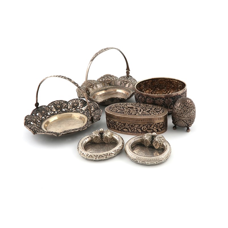 comprising: an Indian bowl, embossed and chased with animals and trees, a pepper pot, two swing-handled baskets, a pierced oval box, and two ashtrays formed form bangles. (7)