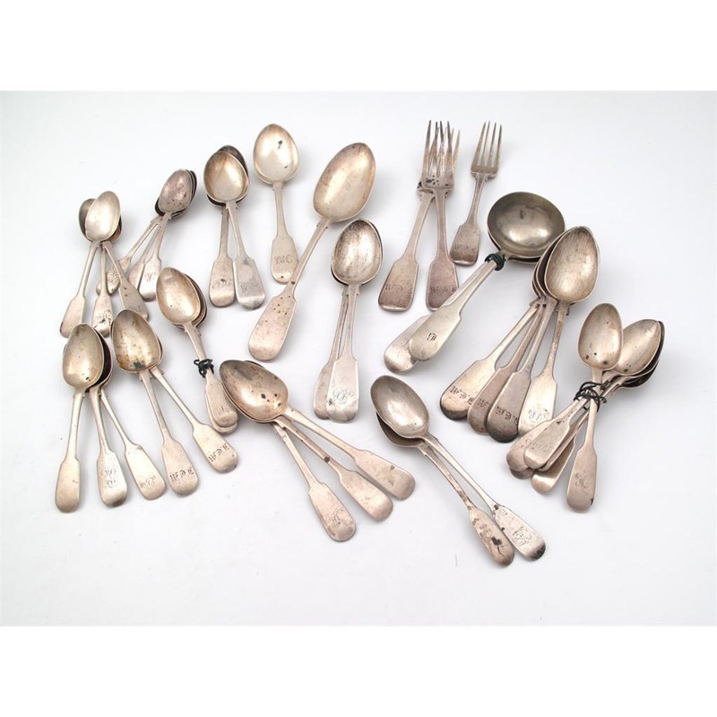 comprising: nine dessert spoons, a table spoon, two table forks, a dessert fork, a sauce ladle, twenty five teaspoons and an electroplated sauce ladle, approx. weight 40oz. (qty)