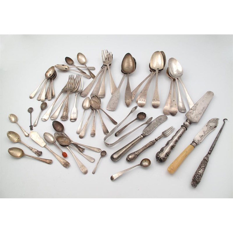 comprising: eight tablespoons, four table forks, three dessert forks, twenty-three teaspoons, a fork, a butter knife, six salt spoons, plus others including electroplated items, approx. weighable 38oz. (qty)