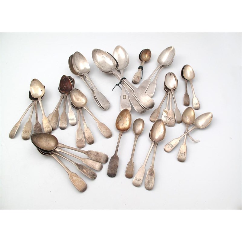 comprising:  four tablespoons, five dessert spoon, twenty-nine teaspoons, and a mustard spoon, approx. weight 34oz. (qty)