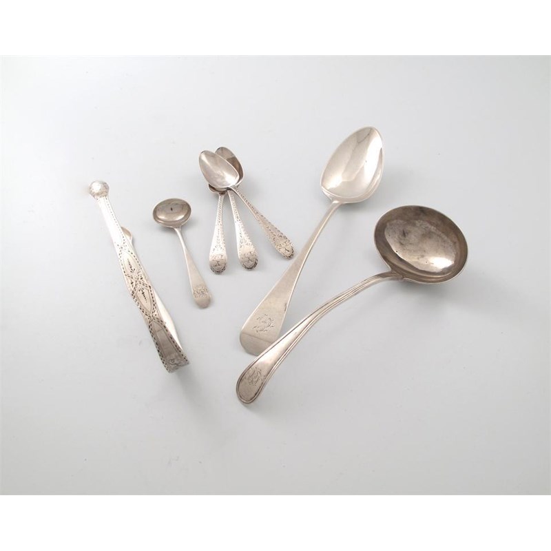 comprising: a pair of Bright-cut sugar tongs, by Hester Bateman, circa 1780,  a set of Bright-cut teaspoons, by Hester Bateman, London 1789, an Old English Thread pattern sauce ladle, by Peter and Ann Bateman, a tablespoon, by Peter and William Bateman, and a salt spoon, approx. weight 6oz. (7)