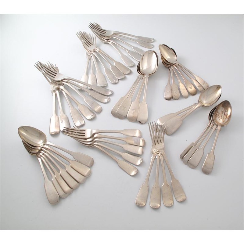 comprising: seventeen table forks, nine dessert forks, seventeen dessert spoons, four tablespoon, plus one electroplated fork and three electroplated dessert spoons, approx. weight 92oz. (qty)