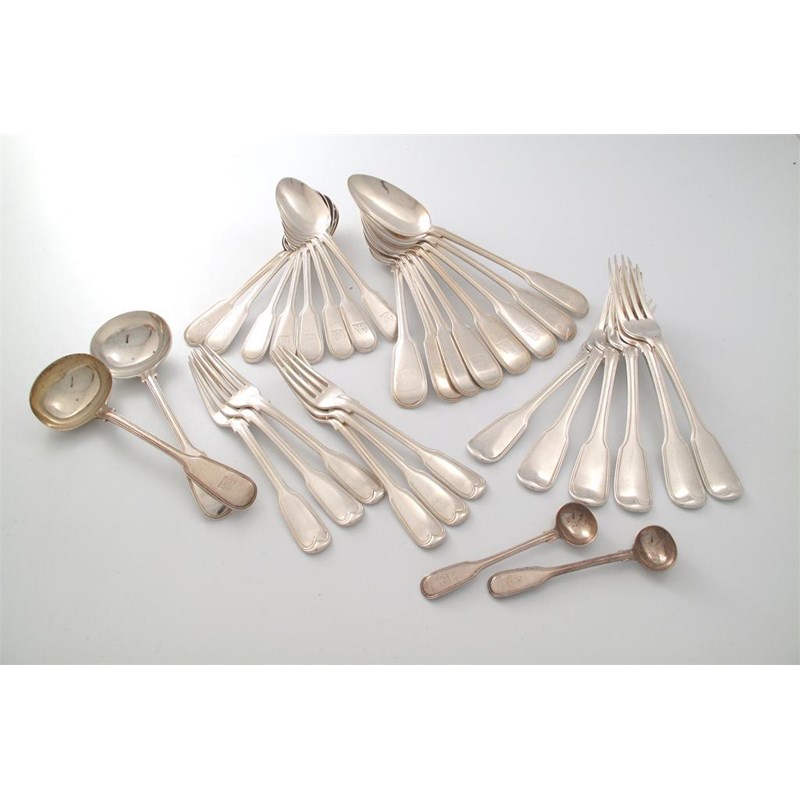 the terminals with a crest, comprising: six tablespoons, six table forks, six dessert forks, eight dessert spoons, a pair of sauce ladles and a pair of salt spoons, approx. weight 72oz. (30)