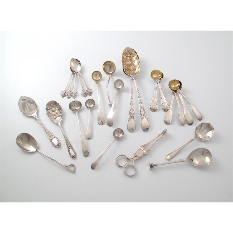 comprising: a pair of 18th century sugar nips, a set of four Fiddle and Thread pattern salt spoons by George Adams, a pair of berry spoons, a seal top spoon. a set of five teaspoons, two jam spoons three condiment ladles, four salt spoons and three electroplated items, approx. weighable 14oz. (qty)