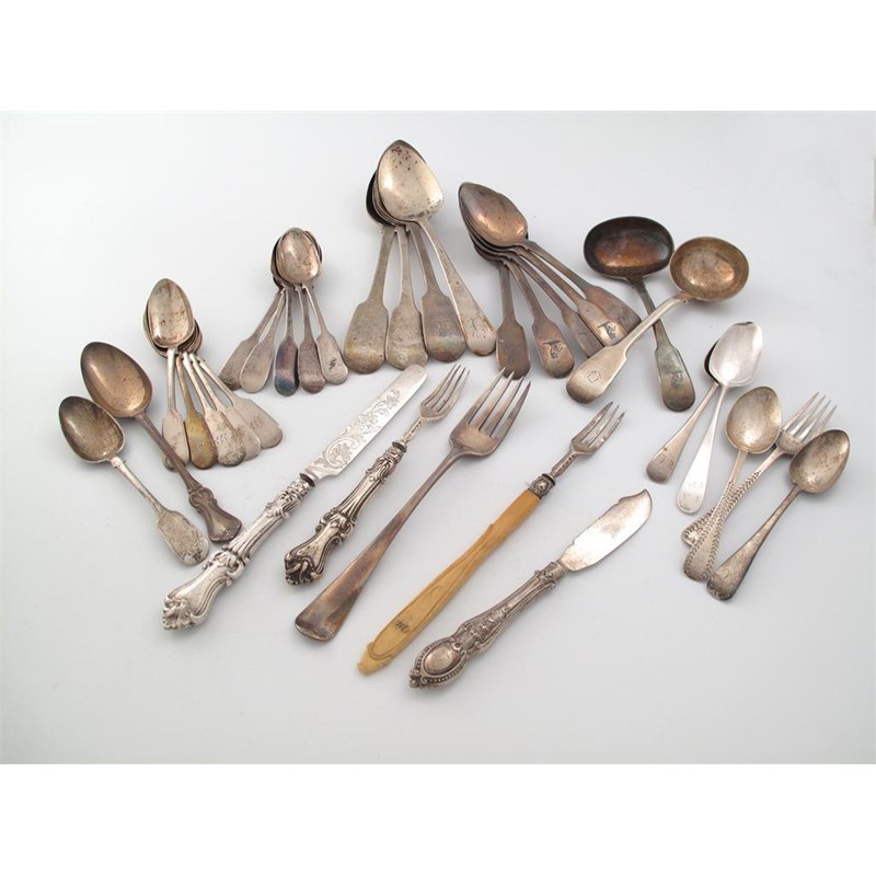 comprising: four tablespoons, five dessert spoons, two sauce ladles, fifteen tea spoons, a table fork, a three-piece christening set, plus a butter knife, pickle fork and christening fork, approx. weighable 30oz. (qty)
