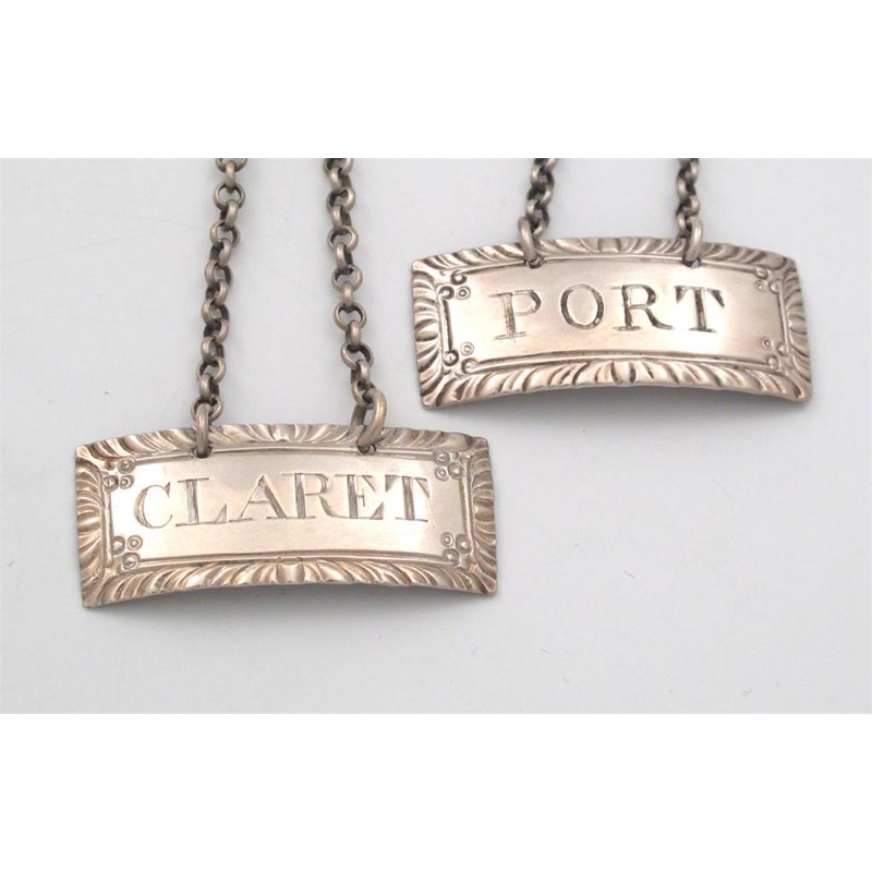 rectangular form, feather-edge borders, incised 'CLARET' and 'PORT', length 4.3cm. (2)